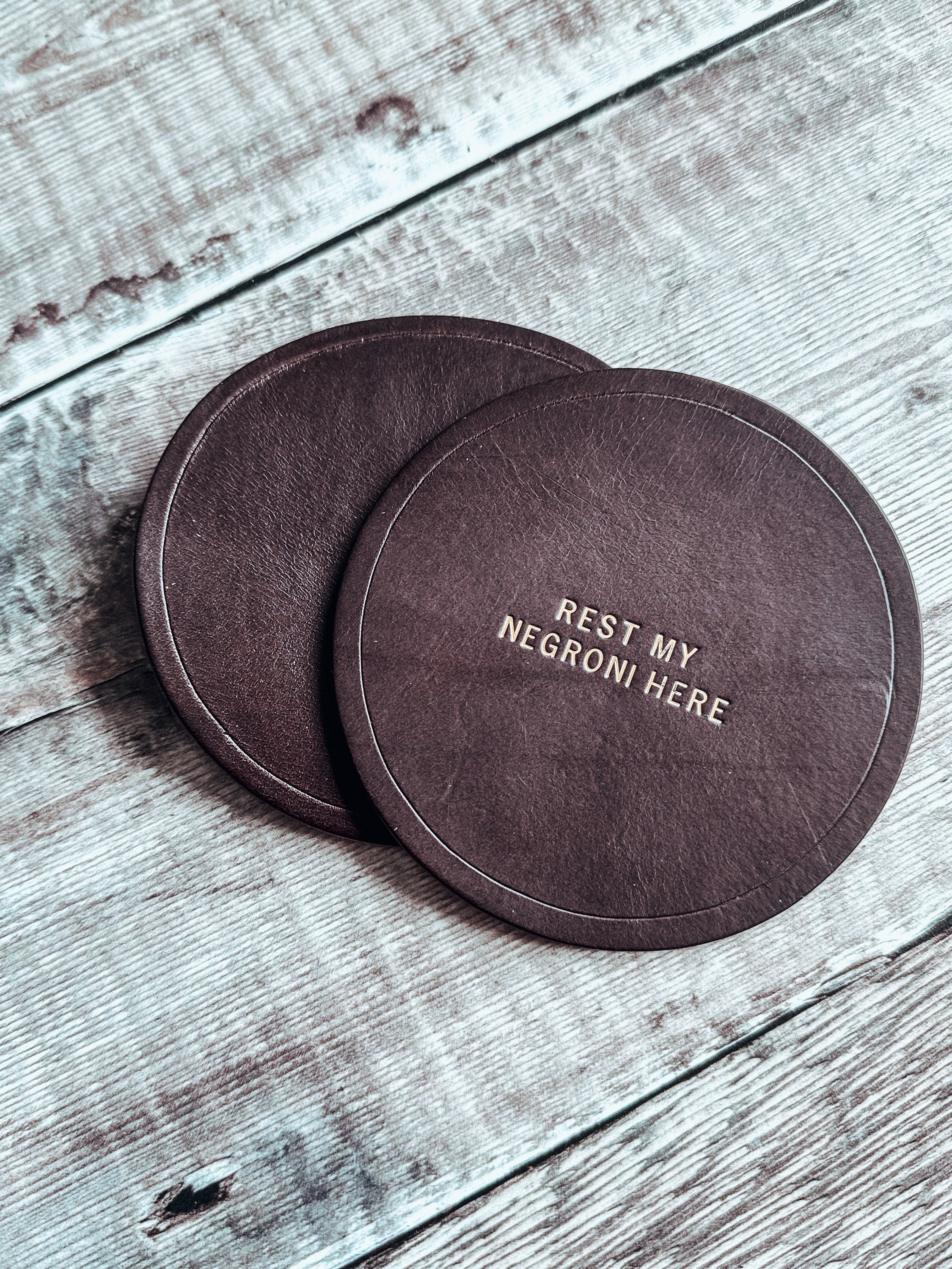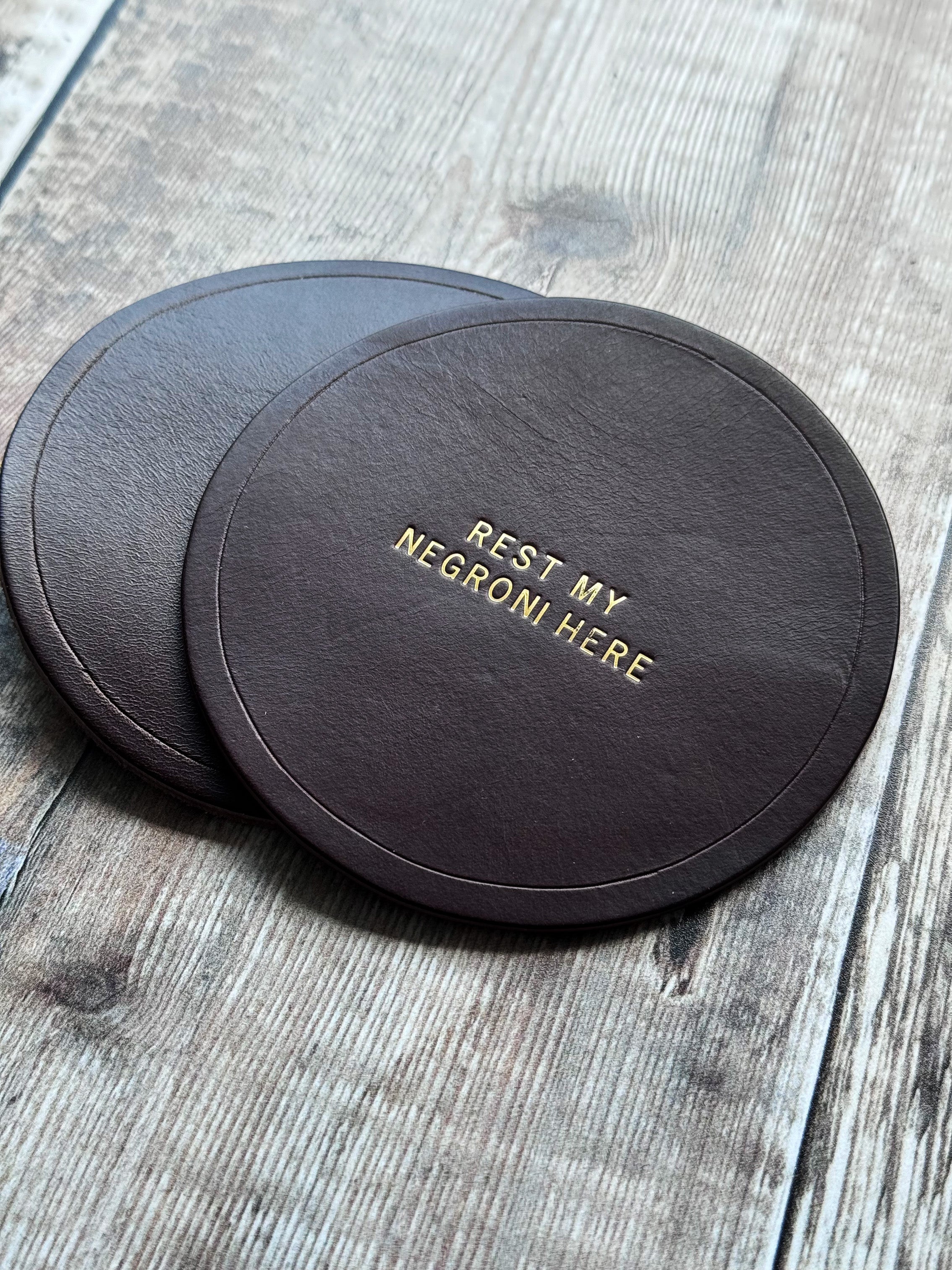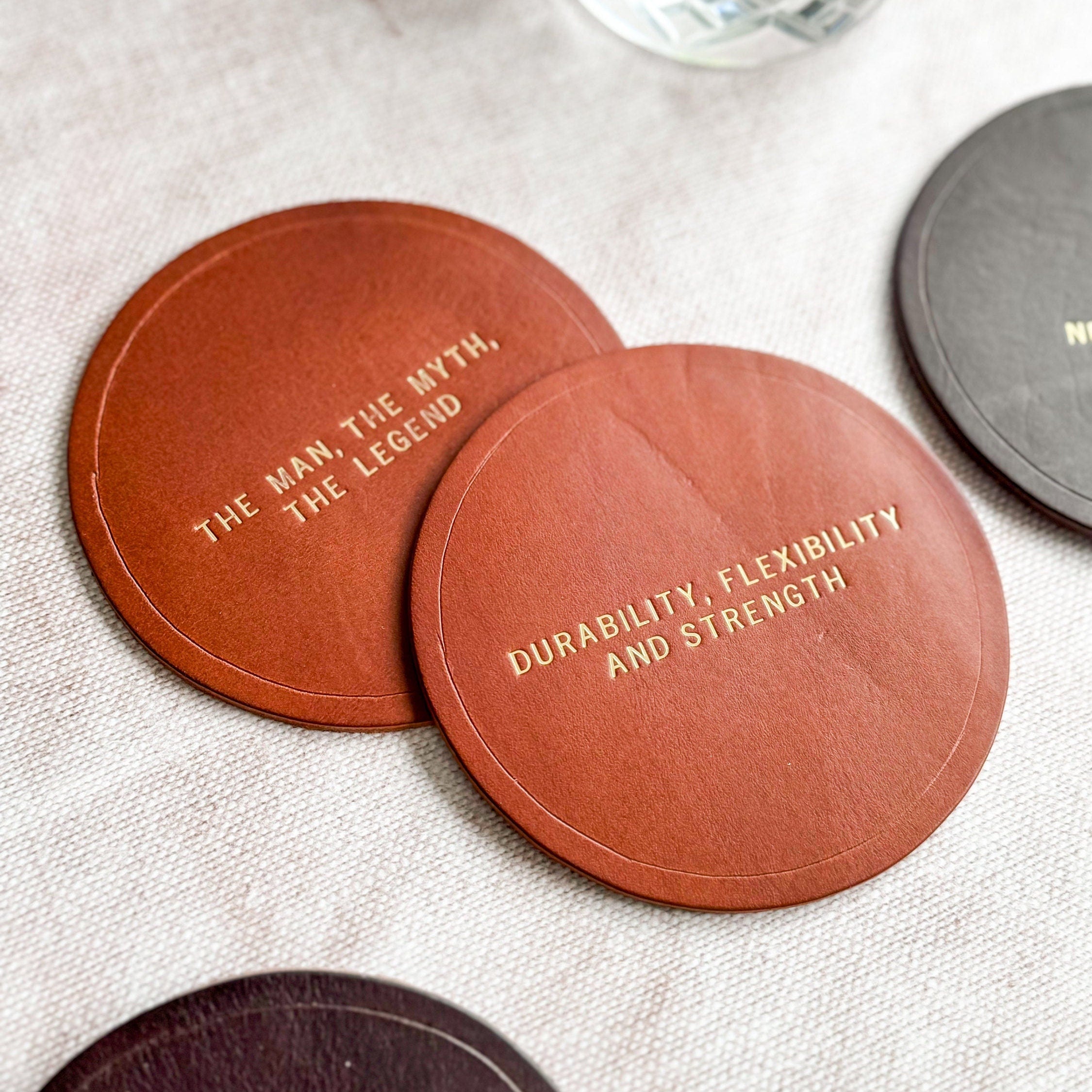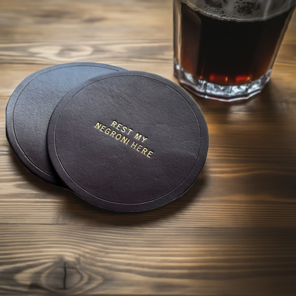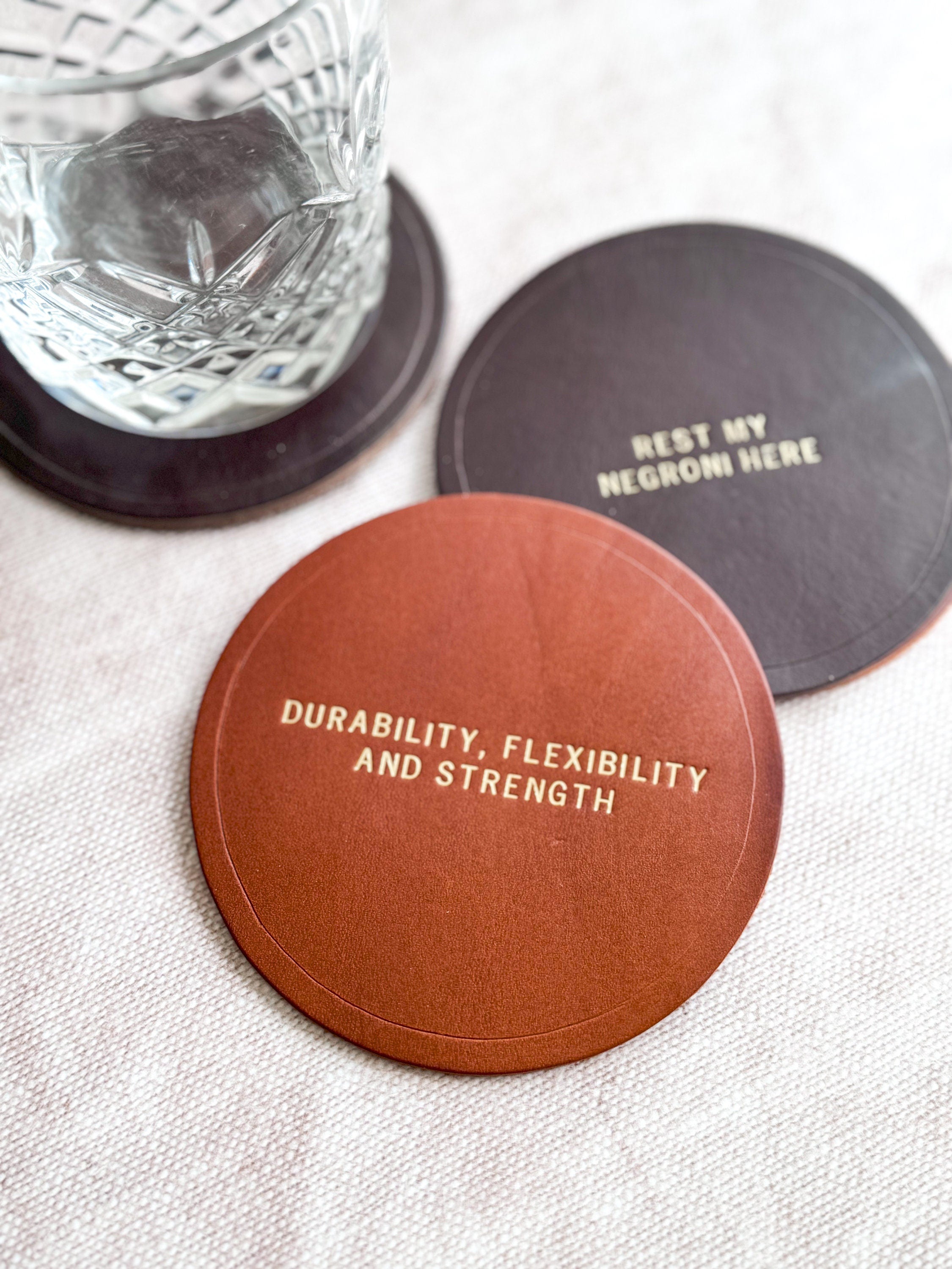 These vintage coloured coasters make the perfect gift to add a chic look to your house! Ideal gift for a 3rd anniversary, Father's Day gift or for your home office. Each coaster is made out of walpier buttero leather. Personalise the coaster with a saying, a wedding date or a cheeky message.