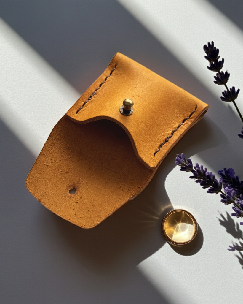 Keep your most treasured jewellery safe with our handcrafted leather ring purse, beautifully designed to hold your engagement ring, wedding band, or other small keepsakes. Each piece is carefully made by hand from premium, sustainably sourced leather and finished with a timeless brass stud fastening.