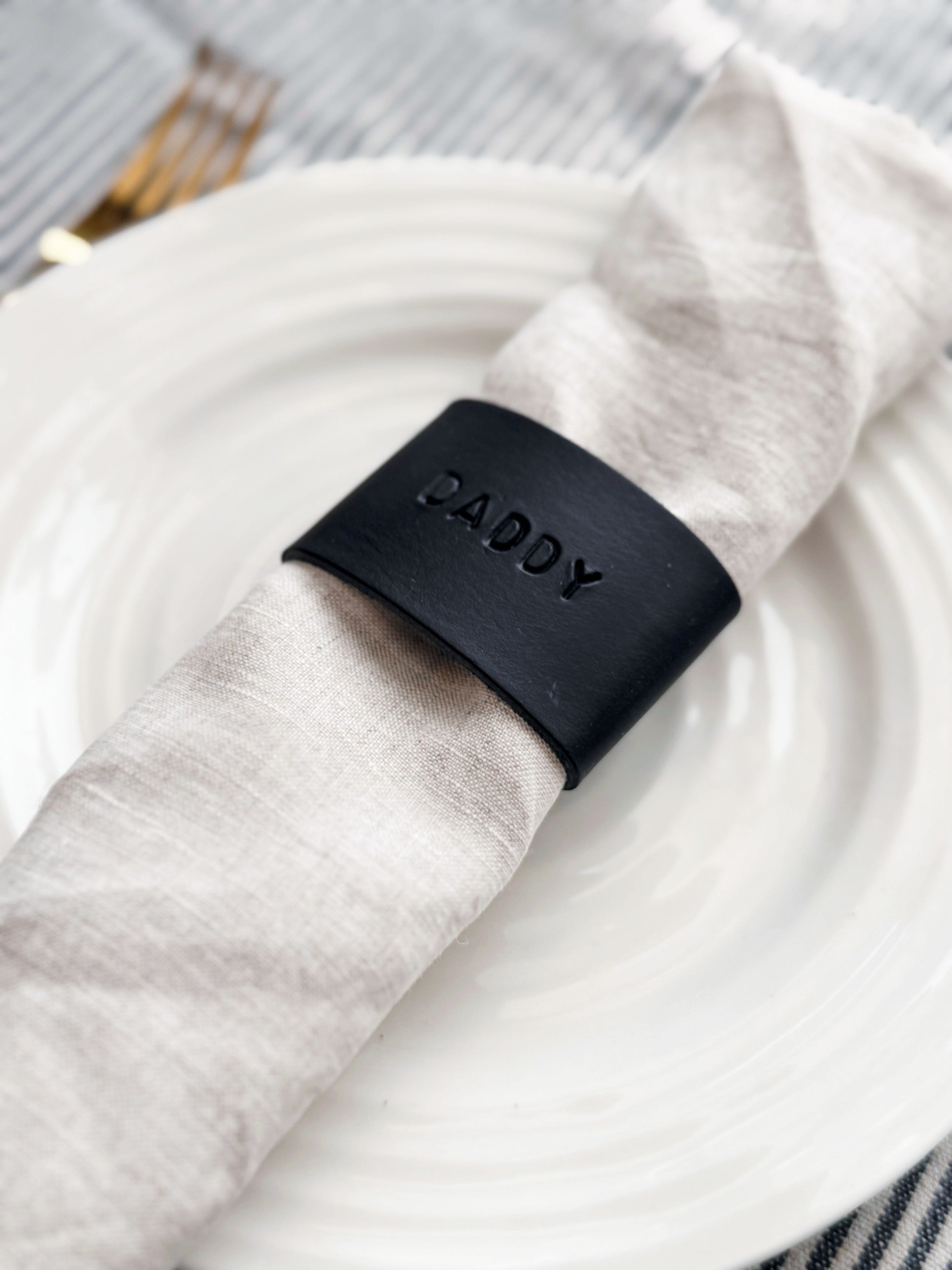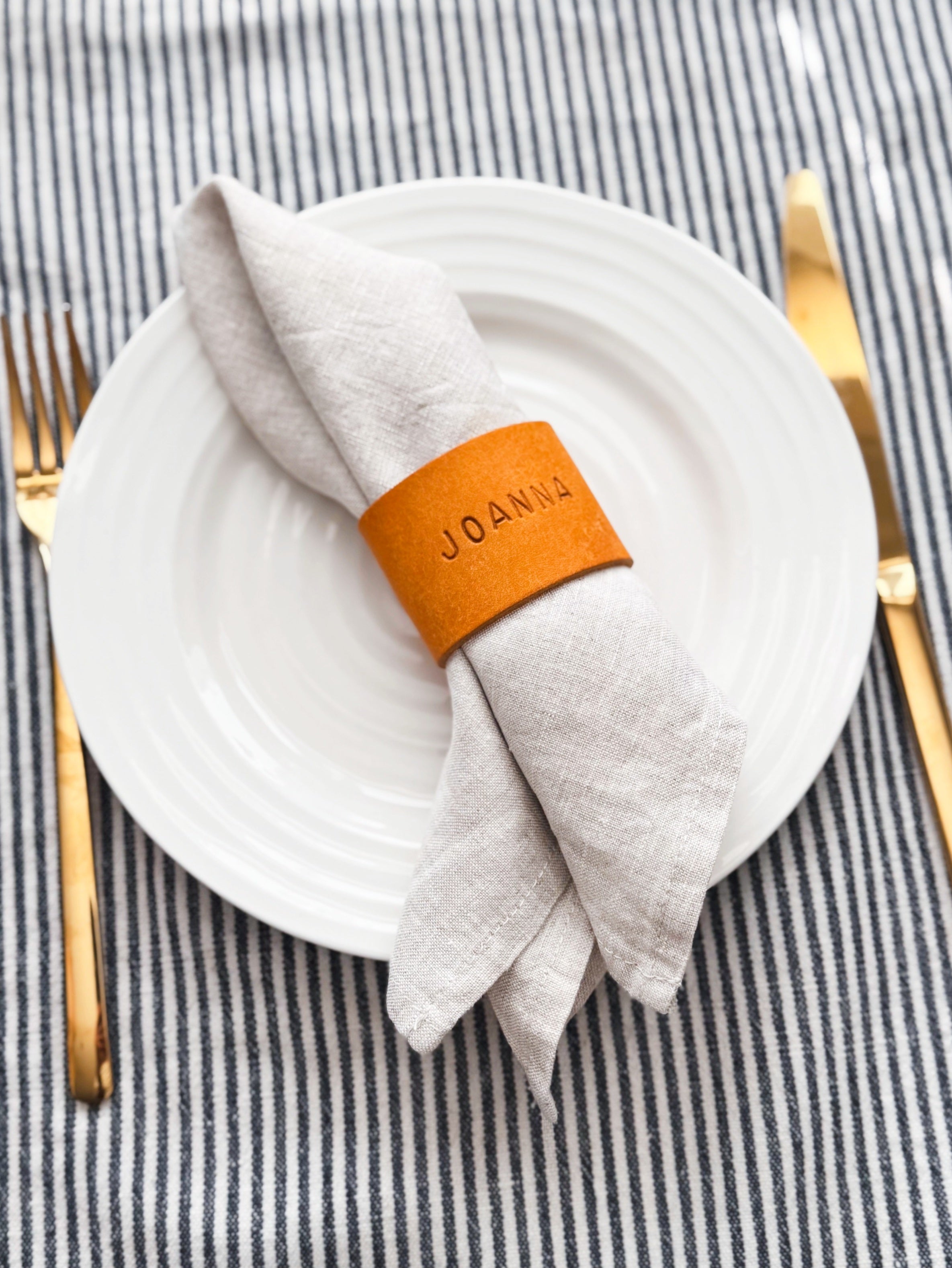 Add a touch of timeless elegance to your table with these handcrafted leather napkin rings. Each one is made from premium, vegetable-tanned leather and hand-stamped with your chosen name or word — creating a truly personal detail that will elevate any dining occasion.