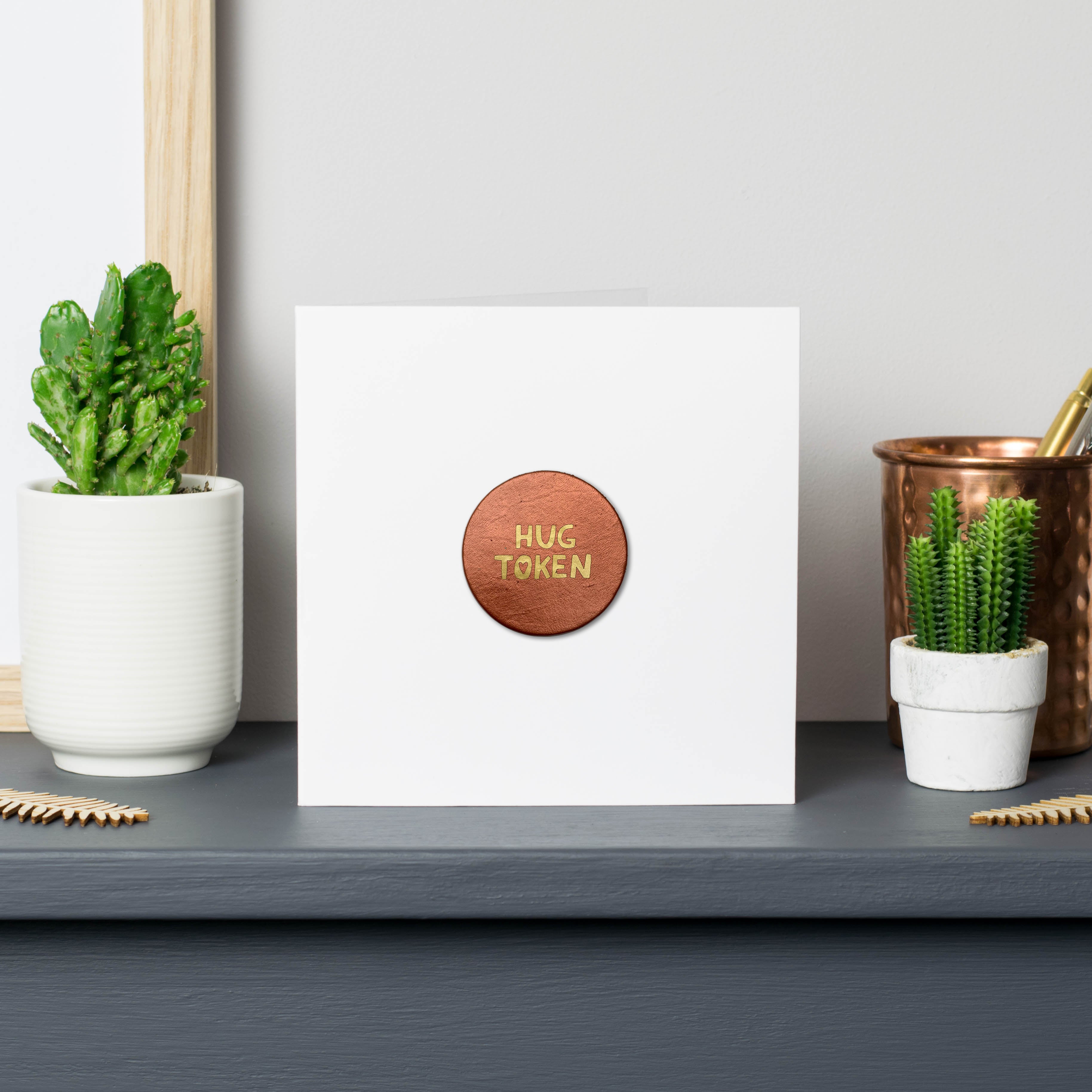 Locked-down in quarantine because of a global pandemic? Got a friend or family member overseas? Maybe your best friend has moved far away? Send them a hug token on a card! Let them know that you're thinking of them and when you finally see each other again, you'll owe them a big fat hug! Bring a smile to their face with this thoughtful, simple expression of love and kindness. The token is made from leather and can be removed from the card as a keepsake (and redeemed at a later date!)