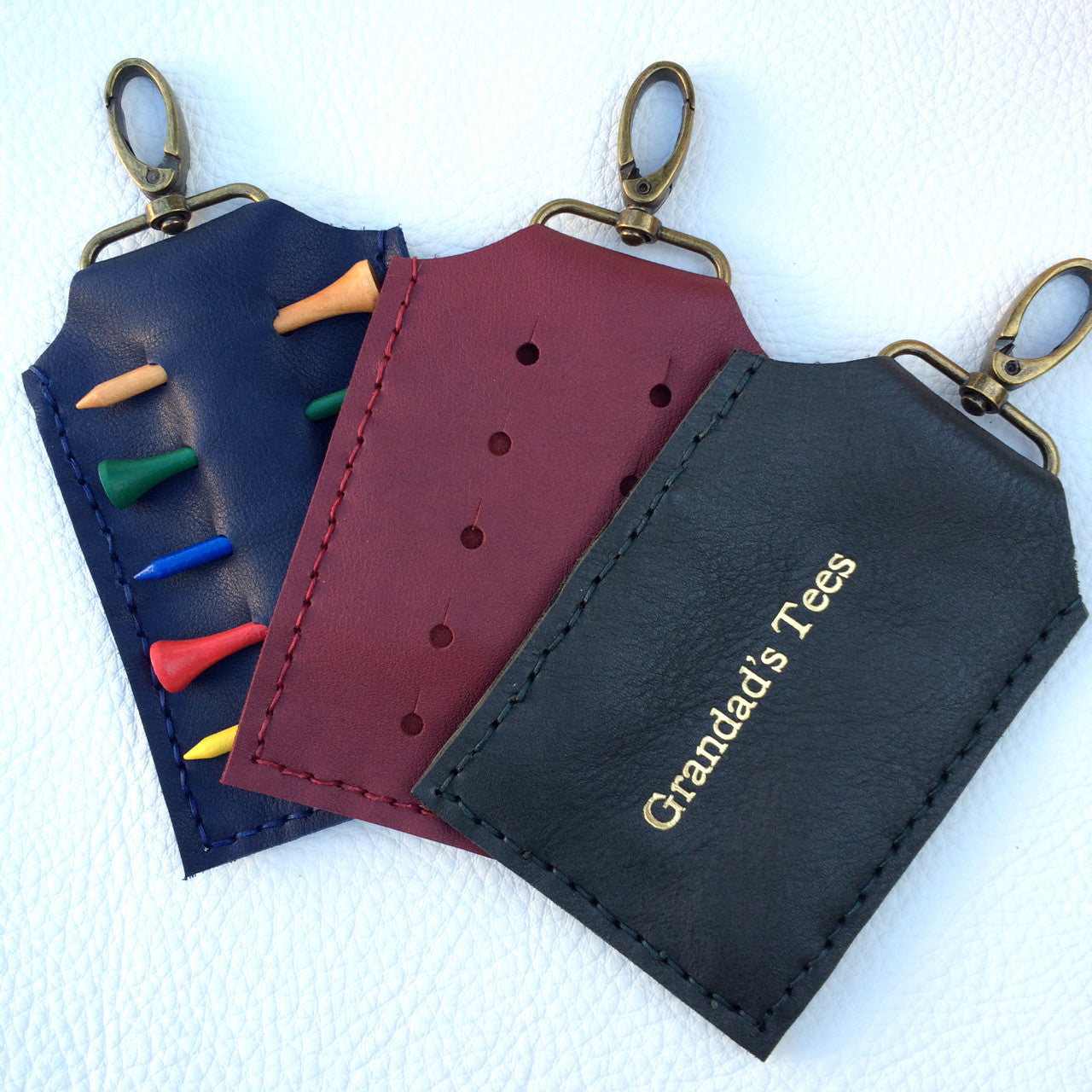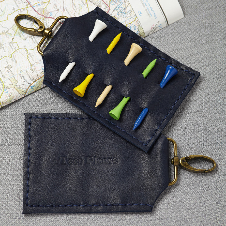 This handmade, personalised, leather golf tee holder from Parkin & Lewis is a stylish and functional accessory for golfers. It looks great in midnight blue.
